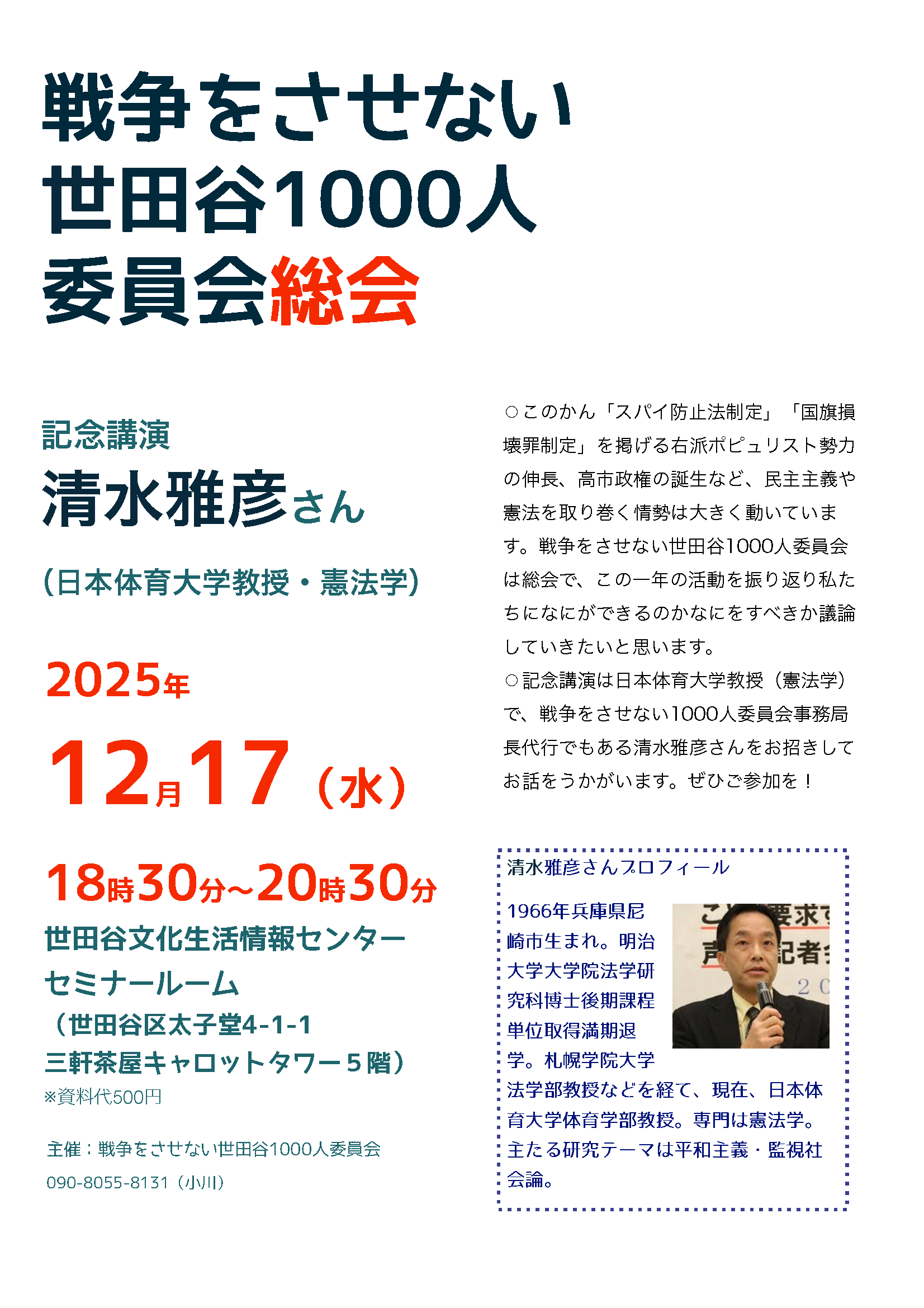 記念講演は日本体育大学教授(憲法学)で、戦争をさせない1000人委員会事務局長代行でもある清水雅彦さんをお招きしてお話をうかがいます。ぜひご参加を!