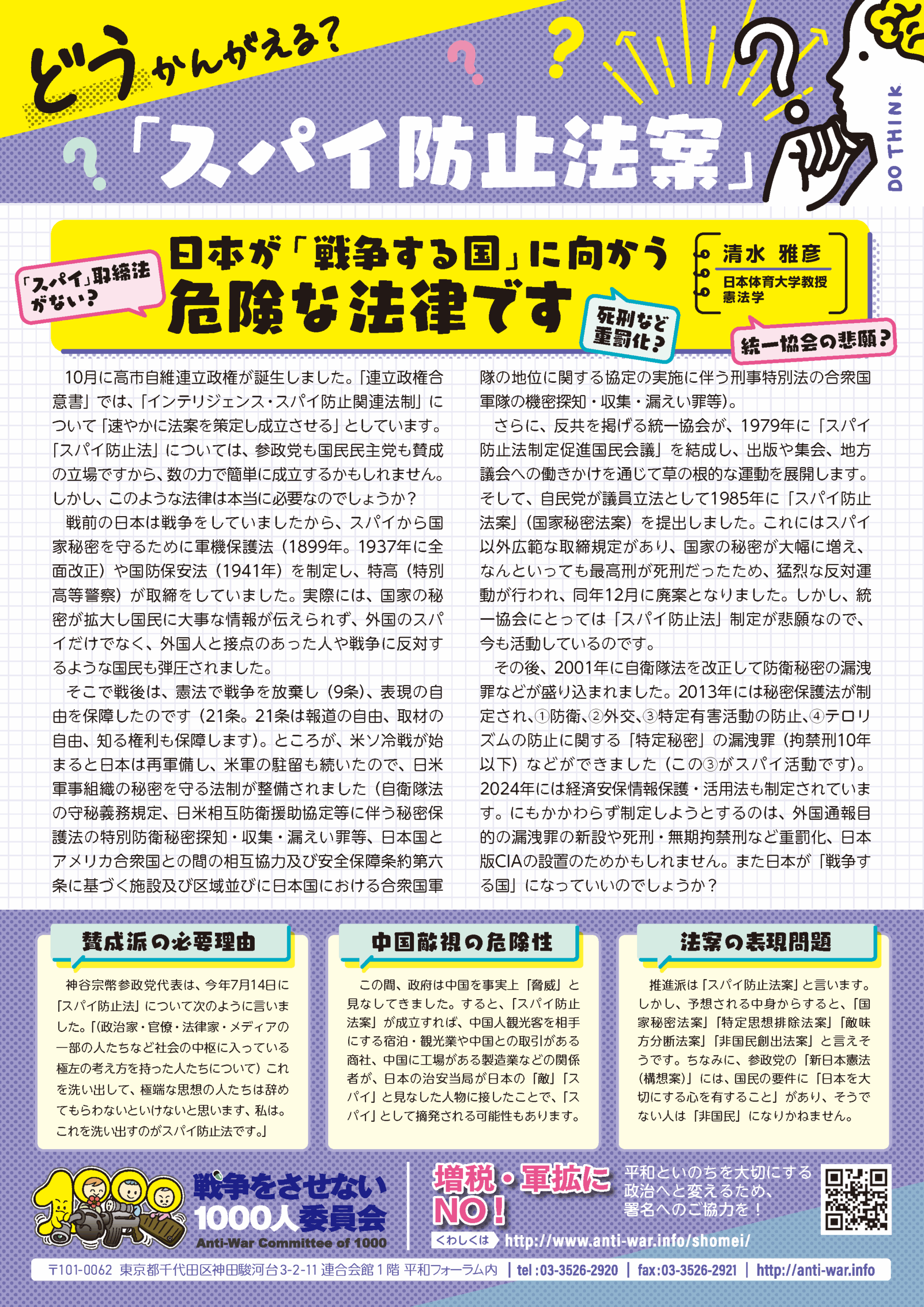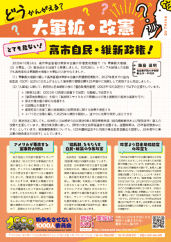 あらたなチラシ「どうかんがえる? 『スパイ防止法案』/大軍拡・改憲」を作成しましたので、ぜひご活用ください。お申込みいただければ、ご希望の枚数お分けいたします。たいへん恐縮ですが、送料のみご負担ください。