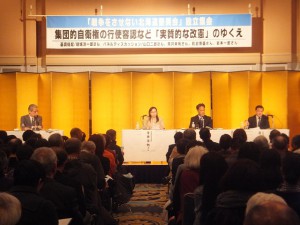 続いて、「集団的自衛権行使容認など『実質的な改憲』のゆくえ」をテーマに、山口二郎・法政大教授(元北大大学院教授)をコーディネーターに、青井未帆・学習院大教授、前泊博盛・沖縄国際大大学院教授、岩本一郎・北星学園大教授をパネリストにしてパネルディスカッションを行いました。山口教授は「世論の力が大事だ。世論調査では、週他薦的自衛権の制度化に反対の意見が増えている。憲法9条を守れという意見が増えている。我々は決して少数派ではない。自信をもって闘っていこう」と訴えました(各パネリストの発言要旨は後日掲載します)。