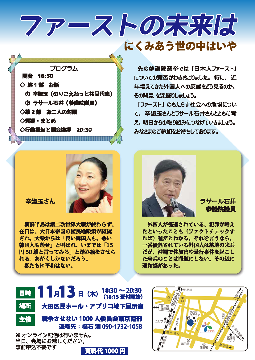 「戦争させない1000人委員会東京南部」が11月13日、講演会「ファーストの未来は にくみあう世の中はいや」を開催しますので、ご紹介します。