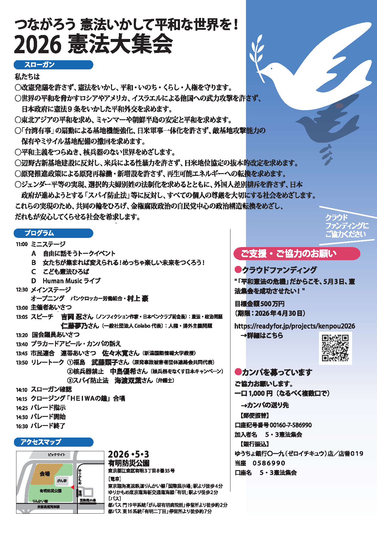 なお、憲法集会の成功に向け、クラウドファンディングに挑戦しています。ご支援いただき、またご家族・ご友人・お知り合いにもご紹介していただくことをお願いします。